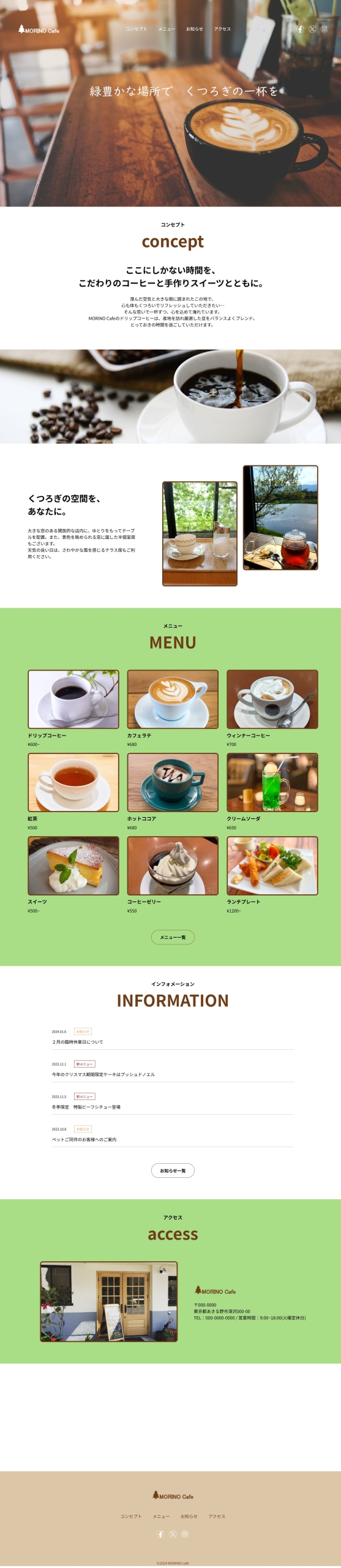 また、お店のイメージに合うように、背景色やタイトルの文字、写真の枠などに森林を思わせるグリーンやブラウンを使用しています。